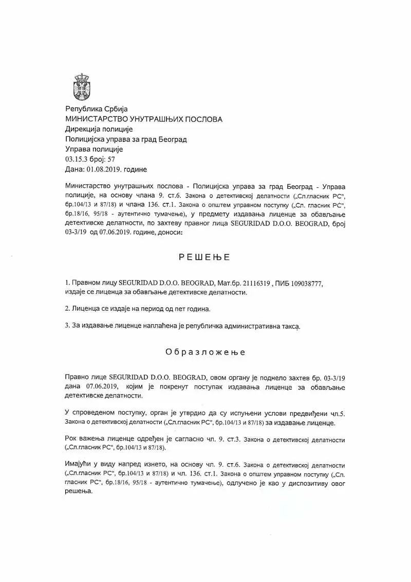 Detektivska agencija Seguridad Beograd licenca 2019-2