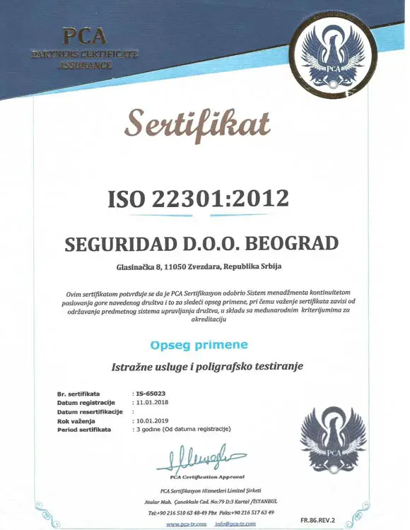 Seguridad Beograd sertifikat iso 22301