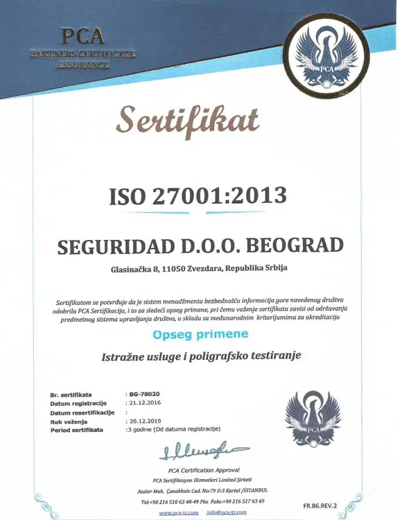 Seguridad d.o.o. Beograd je prva srpska istražna kompanija koja je ispunila najviše ISO standarde za obavljanje istražne delatnosti u Republici Srbiji.